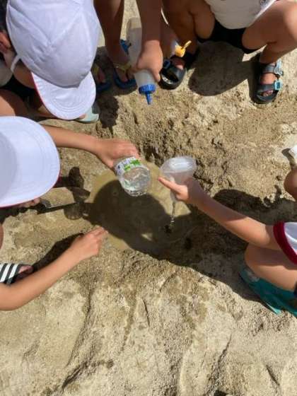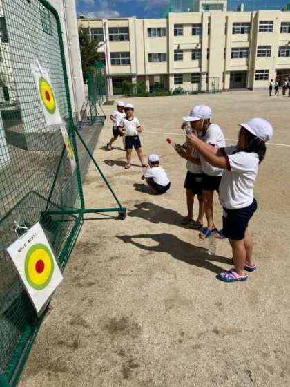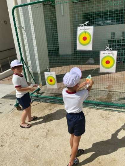 ペットボトルの水を的に当てたり、砂場に穴を掘って水を溜めたりして、思い思いに遊びました。