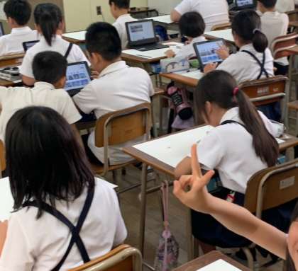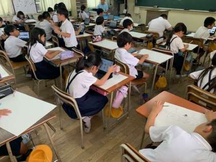 お菓子のお城、お金がかかる宝石のお城、海外のお城などなど子どもたちはタブレット端末も使いながら自分だけのお城を描いていきます。