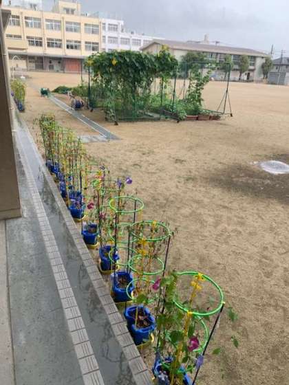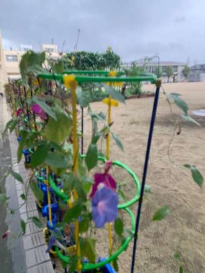まだきれいに咲いているアサガオを見つけました。さぞかし、手をかけて育ててこられたのだと思います。