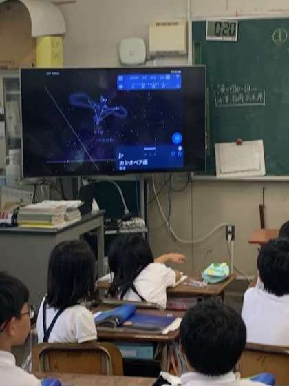星座の光の話を聞いて、今見てる光はもしかするとずいぶん昔に発した光かもしれないよ。と先生から話を聞いて、驚いている子もいました。