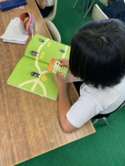 自分の読みたい本を探して、自分の席で読む時間です。とってもくつろいでいる子を見つけました。