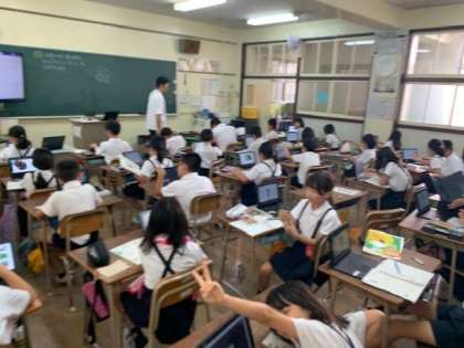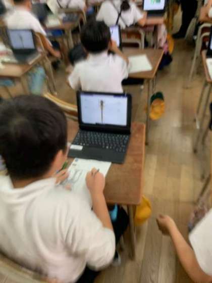 虫の体をワークシートに書き写していきます。トンボやカマキリ、カブトムシ、クワガタ…。子どもたちがタブレットのネット検索で見つけた画像を見て観察していきます。