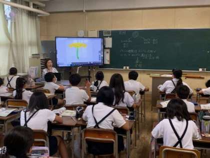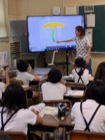 花のつくりの学習で、めしべについて学んでいます。どの部分が「実」になるのか画面に直接書いていきます。