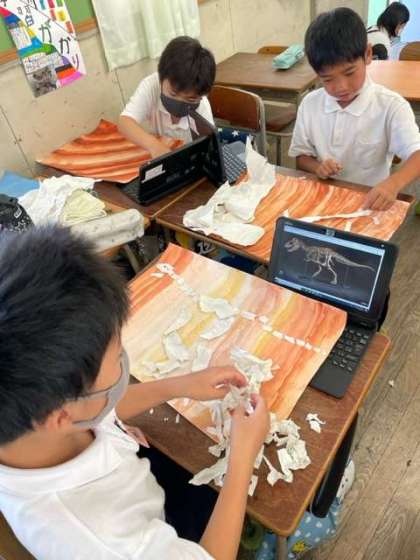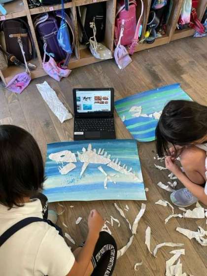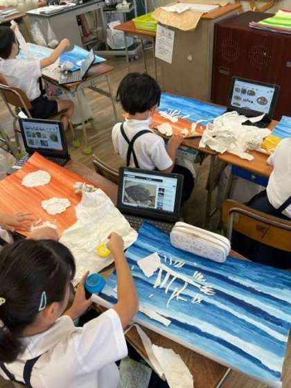 学習用端末で「恐竜」の画像を検索して「ちぎり絵」を作成しています。細かくちぎった紙を貼ることで、立体感が生まれます。