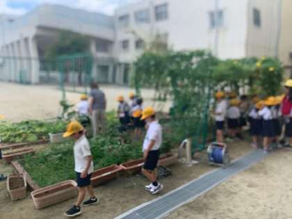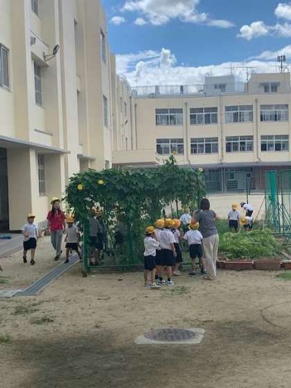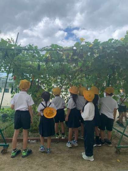 学習園の観察を行っていました。実際にできたゴーヤを触ったり、臭いをかいだりしています。