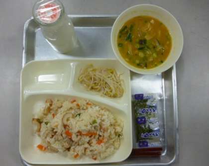 かやくご飯  みそ汁 もやしの甘酢あえ 牛乳