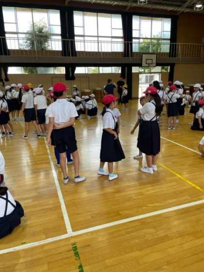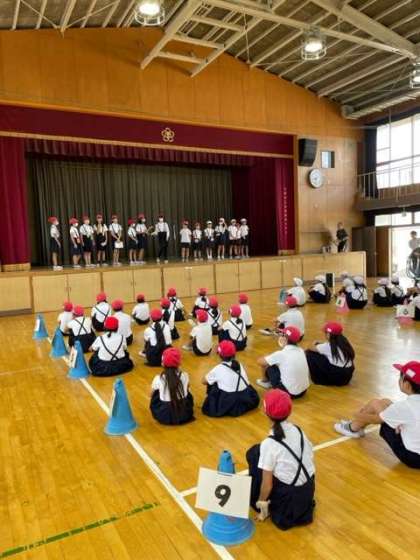 お題の動物の文字数にあたる人数で素早く集まって座るゲームです。3年生と5年生が交流し、楽しい時間を一緒に過ごしました。