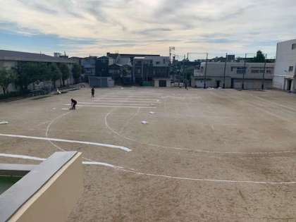 昔は、教職員の手で撒いていましたが、少しでも子どもたちのために関わる時間を増やそうと「働き方改革」を推進しております。