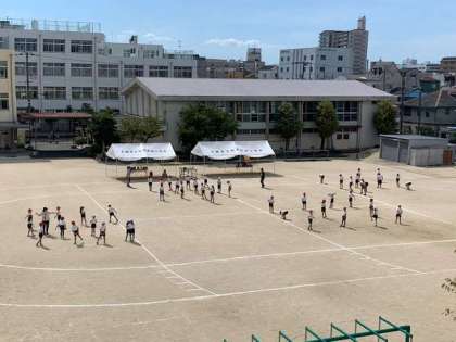 熱中症にならないために、15分から20分に一度の水分補給タイムを設定し、子どもたちは日影で過ごせる時は過ごすようにしています。