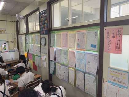 1学期、夏休みの思い出新聞を作りました。教室には、楽しい思い出がいっぱいです。