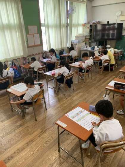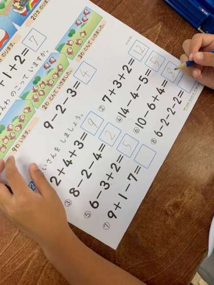 テストに取り組んでいました。手を使って数える子、絵を描いている子、スラスラと答えを書く子、いずれにしても一生懸命に答えを導こうとする姿がすばらしいです。