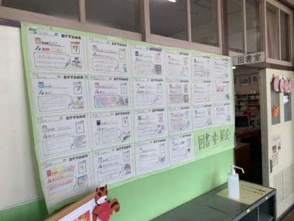 子どもたち一人一人がおすすめの本を紹介しようと廊下に紹介文を貼り出しています。