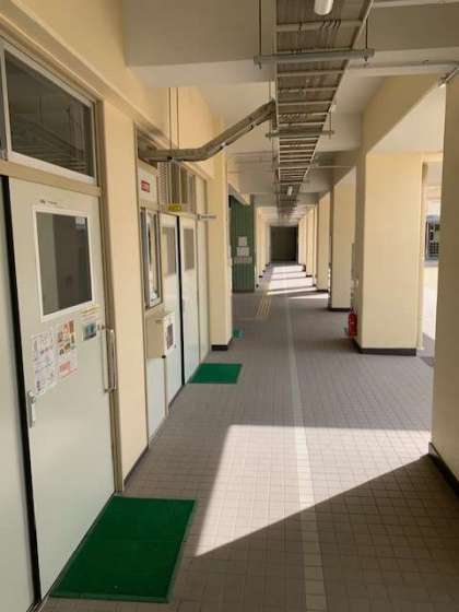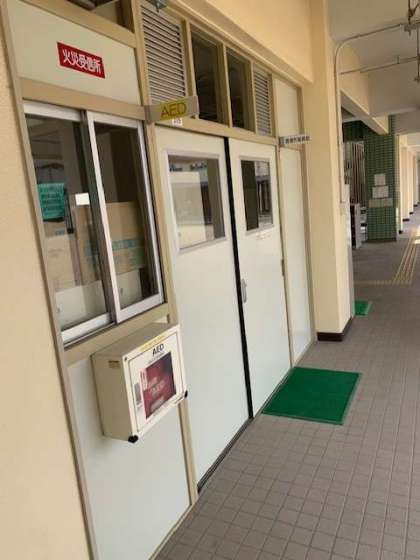 一階の正門入って右側の管理作業員室前にあります。使うことがないことが一番よいのですが、万が一の時にはここにあります。