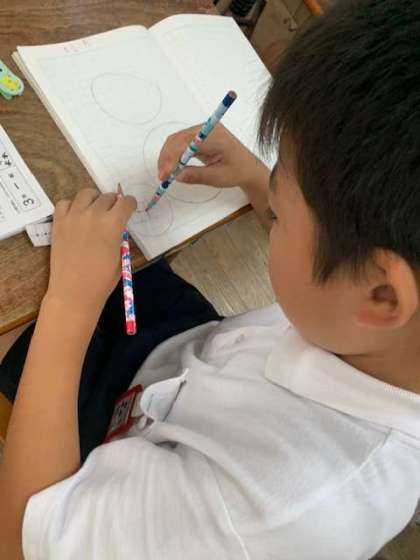 まるい形を描こうと鉛筆二本でチャレンジです。