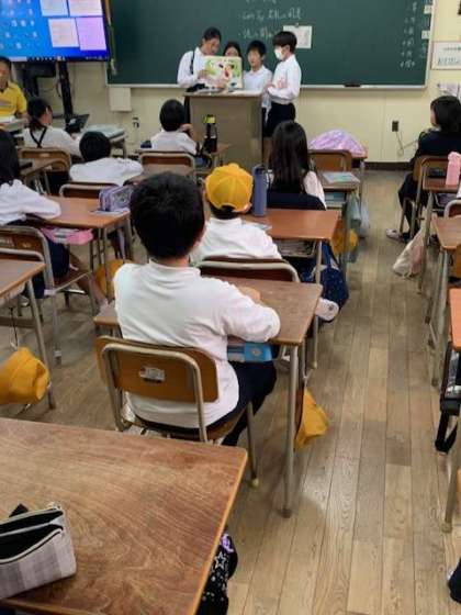 今朝は、図書委員会(4年から6年)が1年から3年の教室に本の読み聞かせを行いました。