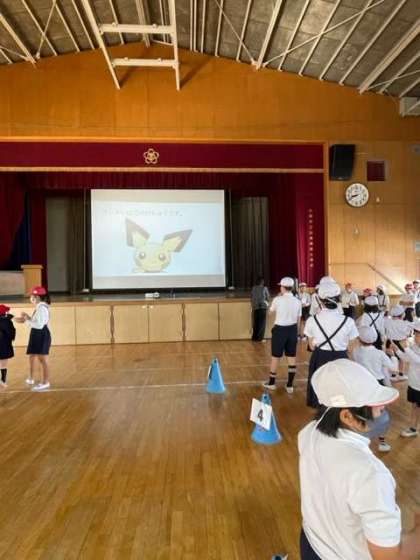 今朝の児童集会は、1年生と6年生のペアで「キャラクターシルエットクイズ」を行いました。