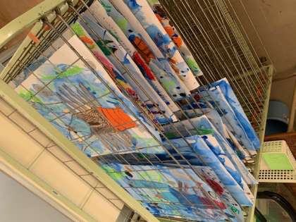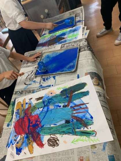 クレパスで、描いたザリガニを水の中にいるように水彩絵の具の青色で塗り重ねていきます。
