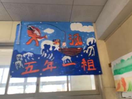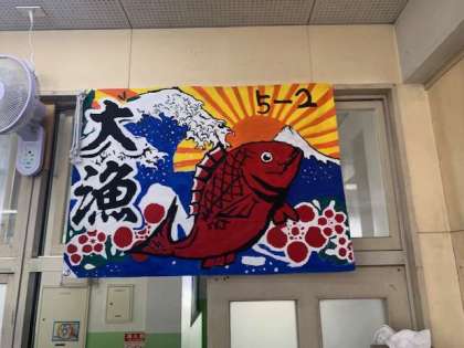 運動会のソーラン節で、使われた「大漁旗」をそれぞれの教室で掲示しています。