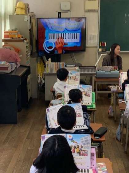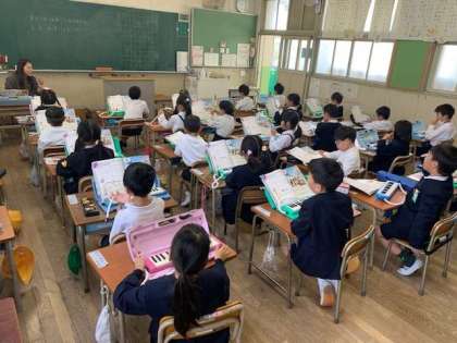 鍵盤ハーモニカの指使いを確認です。「ミ」は中指、「ファ」は薬指、「ソ」は小指へのスムーズに押さえていくのには、練習がいりそうです。ここに吹き口をくわえて、息を吹き込む作業も入ります。