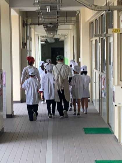 学級みんなの給食を「責任」もって運びます。落としたり、こぼしたりしたら、みんなが困ります。