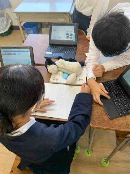 「町の幸福論」という教材文から、自分たちでプレゼンテーションをする内容を班で話し合って決めていきます。タブレットでパワーポイントを作る子、プレゼン内容を考える子等、役割分担を行いながら進めていきます。