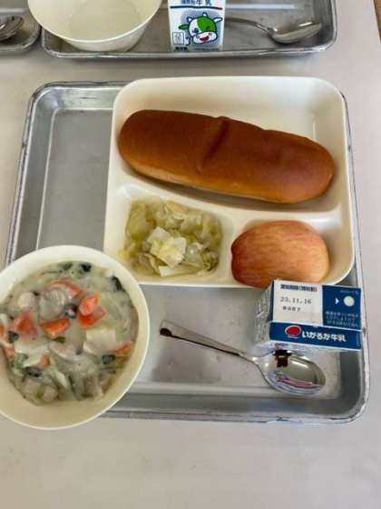 今日の献立は、キノコのクリームシチュー、リンゴ、キャベツのピクルス、パン、牛乳です。