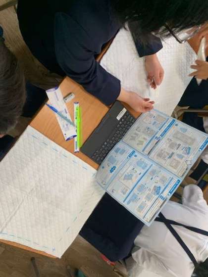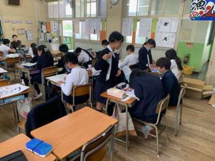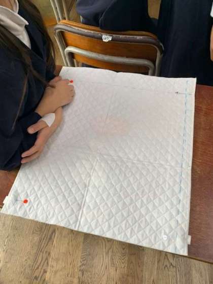ナップサック作りが始まりました。下準備にチャコペンやまち針を使います。友だちと協力して行う姿は、学校でしかできないかけがえのない光景だと感じます。