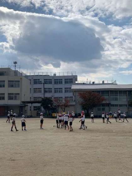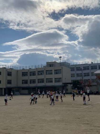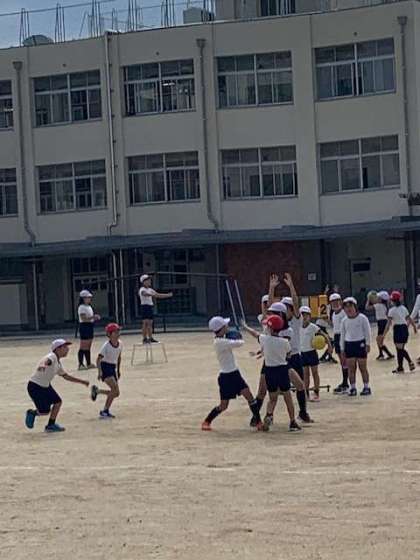 今はポートボールに取り組んでいます。子どもたちは、少し寒い中でも大きな声をかけ合いながら動いています。