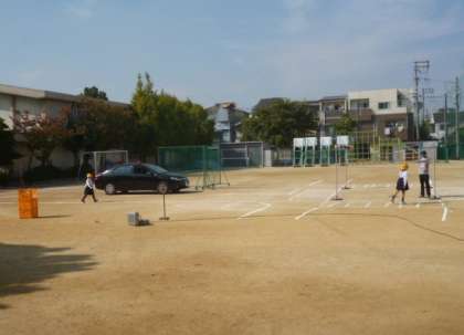 20日(火)に運動場で交通安全教室を行いました。平野警察署交通課の方が来校され1年生と2年生に教えていただきました。運動場にラインを引いて、信号機も置いて歩道や交差点をつくり、安全な歩き方を体験しました。