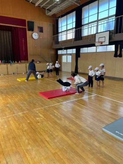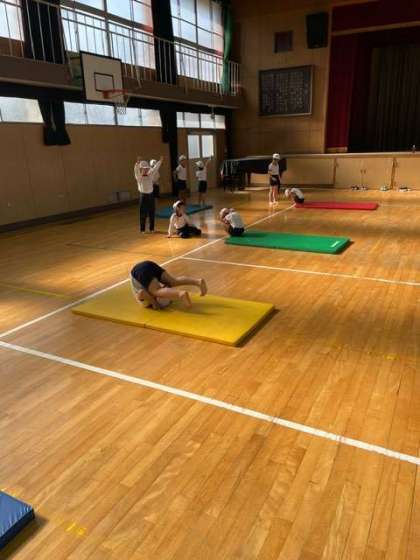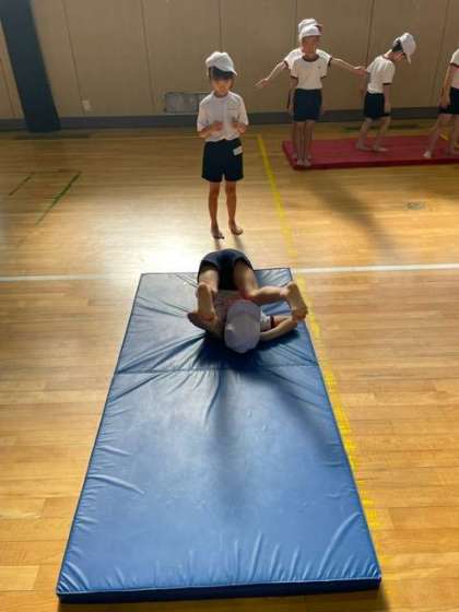 後ろまわりでは、手のひらでマットをしっかり押すことができたらスムーズに回れます。