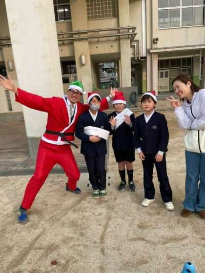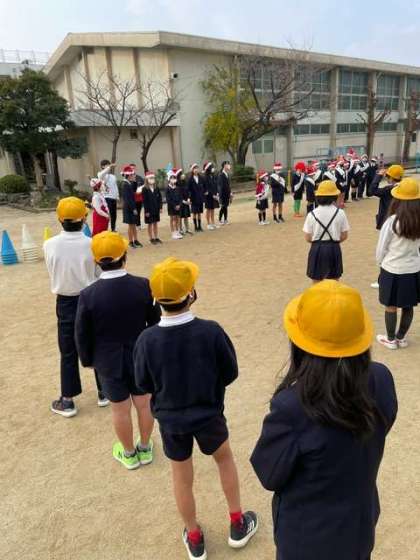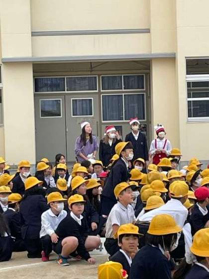全校児童が運動場でクリスマスに関する3択クイズを行いました。たてわり班で相談して答えを考え、三つの場所(「1」「2」「3」に立っている先生や委員会の人がいるところ)に大移動します。