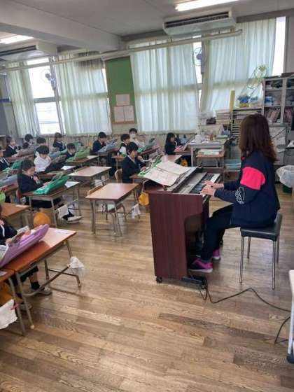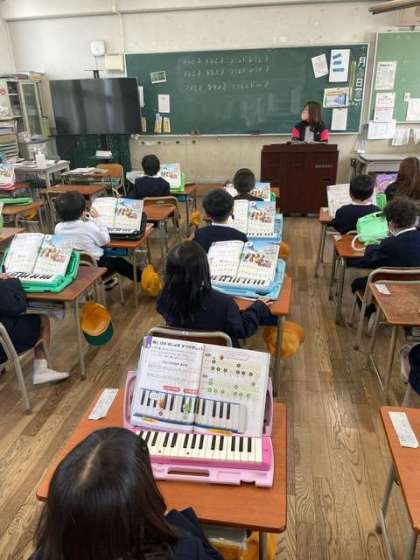 職員室に、綺麗な音色が聞こえてきました。様子を見に行くと、1年生が教室で鍵盤ハーモニカの合奏と合唱をしていました。