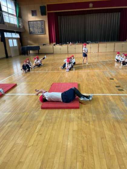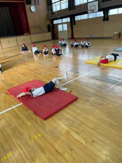 マットの上で、いろいろな転がり方をして楽しみました。遊びを通して、さまざまな感覚が養われていきます。