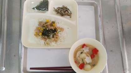 今日の給食には「ぞう煮」と「ごまめ」が出ました。