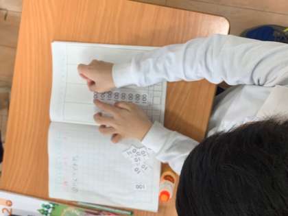 「数のしくみを調べよう。」と千の単位、百の単位、十の単位、一の単位と表に分けて考えていきます。今日も支援者と指導者の2人体制で、授業です。