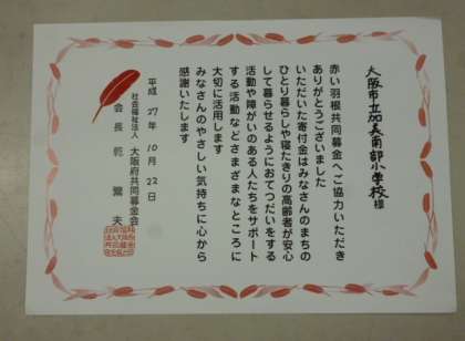 同会からは、上の写真のような感謝状をいただきました。募金活動の結果については、26日に全校朝会で、運営委員の子どもたちが発表しました。