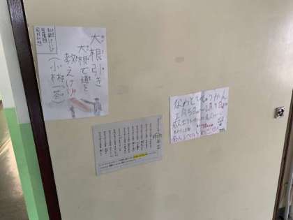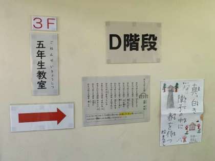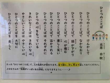 加美南部小学校の階段の掲示物には、北原白秋の「一つの言葉」が貼られています。