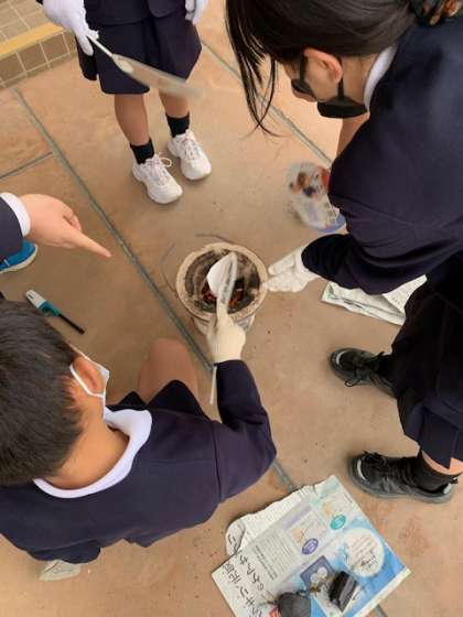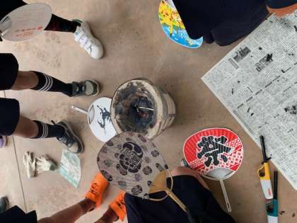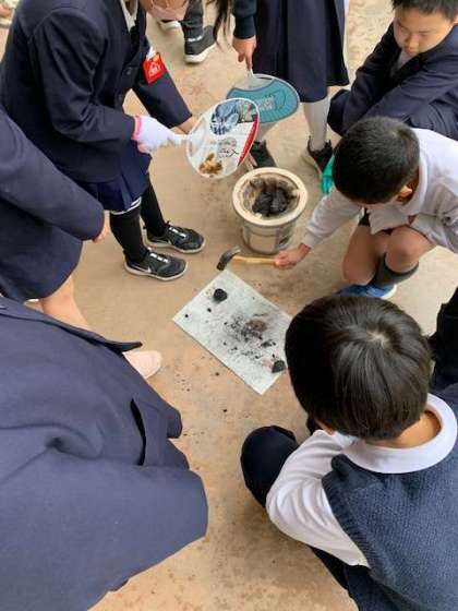 昔の暮らしの体験で、火おこしを行いました。ガスが普及していない時は、毎回このように火を起こして家事をしていたことの体験です。
