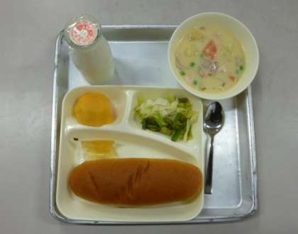 コーンクリームシチュー キャベツと三度豆のサラダ かき(富有柿)