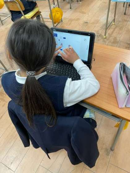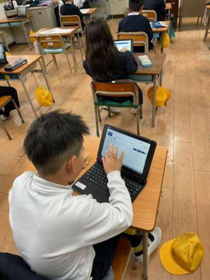 学習用端末を使ってデジタルドリルの教材に取り組んでいました。「書き取り」や「書き順」など漢字の演習を熱心に行なっていました。