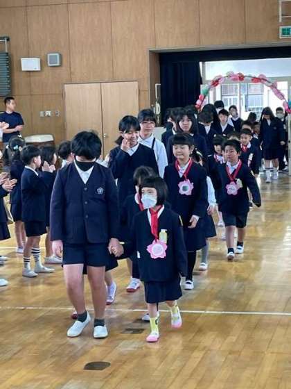 6年生手製のメダルを胸にかけて入場してきた1年生。贈り物として朝顔の種をもらい、校歌の紹介がありました。