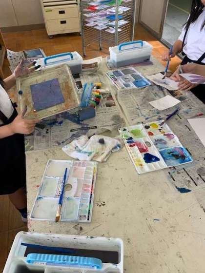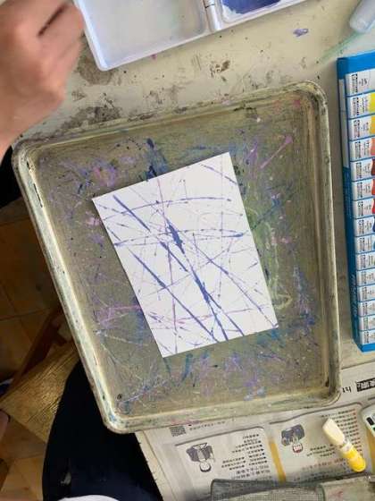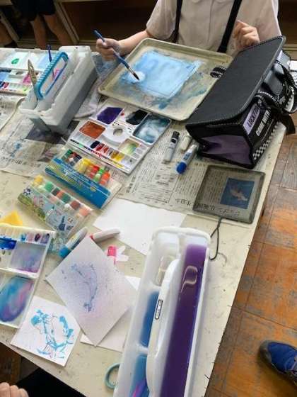 画用紙に、絵の具で様々な手法で描いていきます。とっても楽しい作品がどんどん出来上がっていきます。