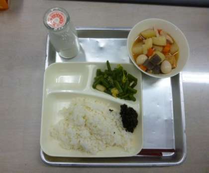 関東煮 三度豆のからしあえ のりのつくだ煮 ごはん 牛乳