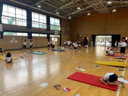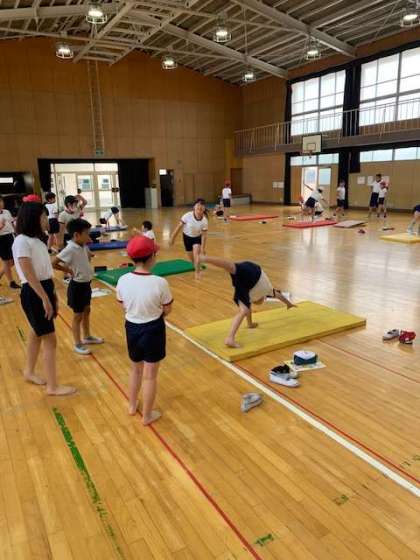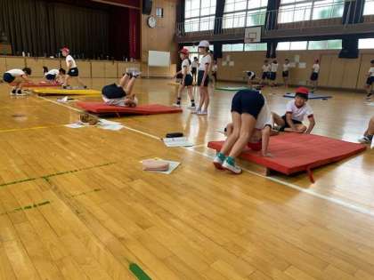 マット運動に取り組んでいました。首はね跳び、側転、開脚前転、開脚後転…と子どもたちは、自分のしたい技にチャレンジです。