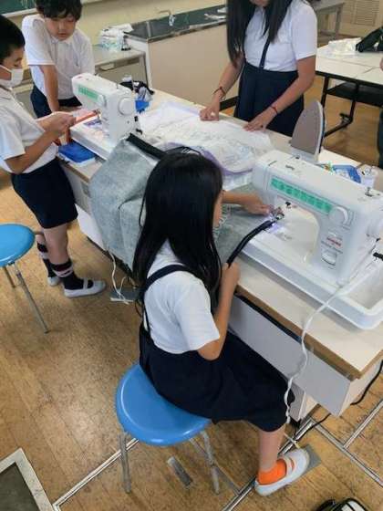 エプロン作りを行っています。5年生で、ナップサック作りを経験しているので、大体の要領は心得ています。班で作製しているので、どの子も協力して作っています。