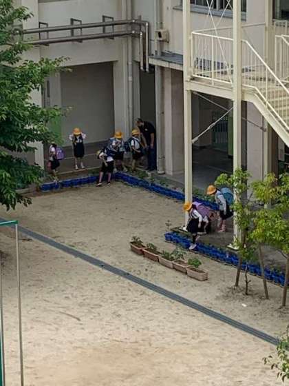 ミニトマトに水やりをして帰ります。一人一鉢なので、自分の分は自分が責任をもって水やりに取り組んでいます。
