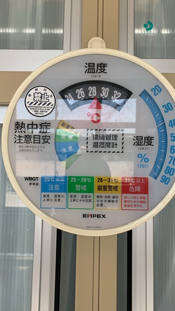 職員室前の廊下でこの温度です。運動場は、もっと気温が高くなっています。