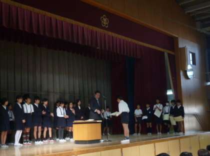 16日の全校朝会(講堂で行いました)で、たくさんの表彰があり、校長先生から一人一人に賞状が手渡されました。