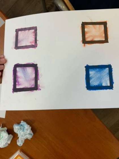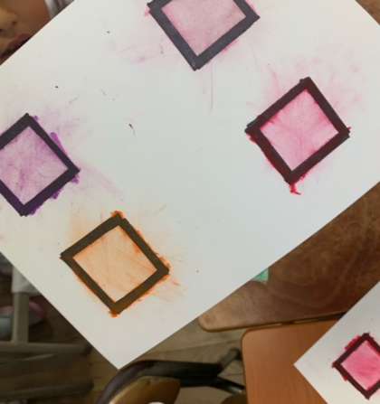 パスで、四角の枠に色を塗り、ティシュペーパーで色を伸ばしていきます。