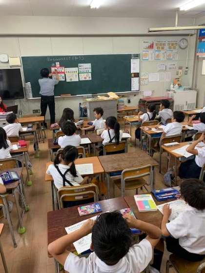 今日は栄養教諭と一緒に「赤、黄、緑」の食品群に分けて、食べ物にはそれぞれどんな役割があるのかを考えています。